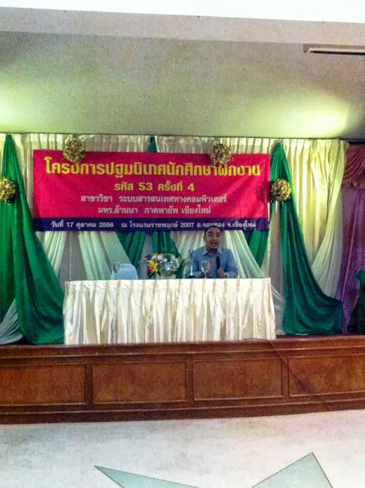 เมื่อวันที่ 17 ตุลาคม 2556 อาจารย์บอมได้รับเชิญให้ไปปฐมนิเทศ นักศึกษาชั้นปีที่ 4 มหาวิทยาลัยเทคโนโลยีราชมงคลล้านนาภาคพายัพ (จอมทอง) ที่กำลังเตรียมตัวออกไปฝึกงานกับบริษัทและองค์กรต่างๆ ในเรื่องการมารยาทและการวางตัวในสถานที่ฝึกงาน โดยมีนักศึกษาเข้ามาร่วมฟังบรรยายในครั้งนี้เกือบ 300 คน